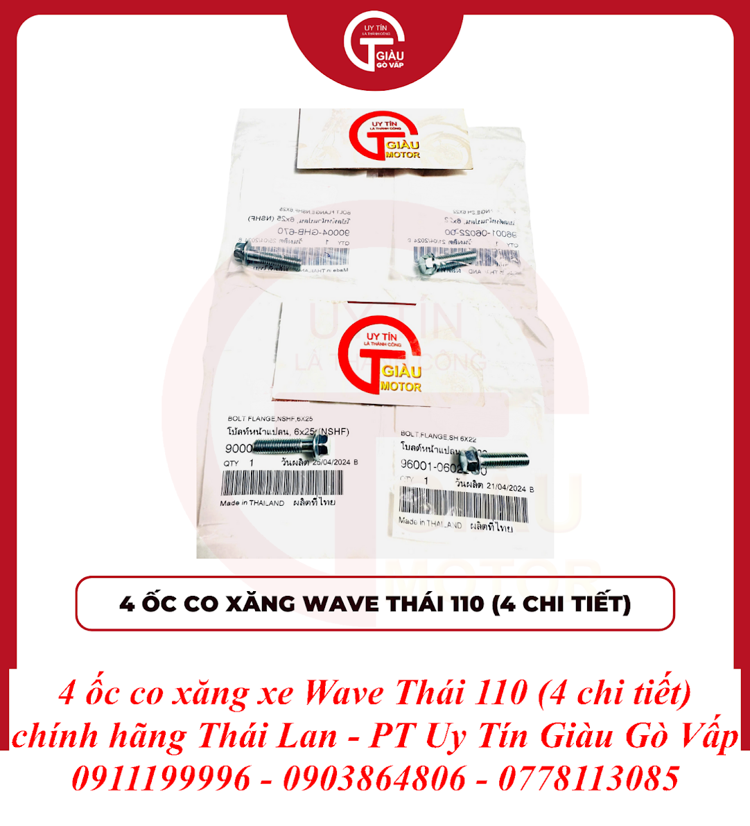 Tại Giàu Gò Vấp, chúng tôi tự hào mang đến sản phẩm Bộ 4 Ốc Co Xăng Wave Thái 110 Chính Hãng Thái Lan với những cam kết vàng, giúp bạn hoàn toàn yên tâm về chất lượng và hiệu suất: