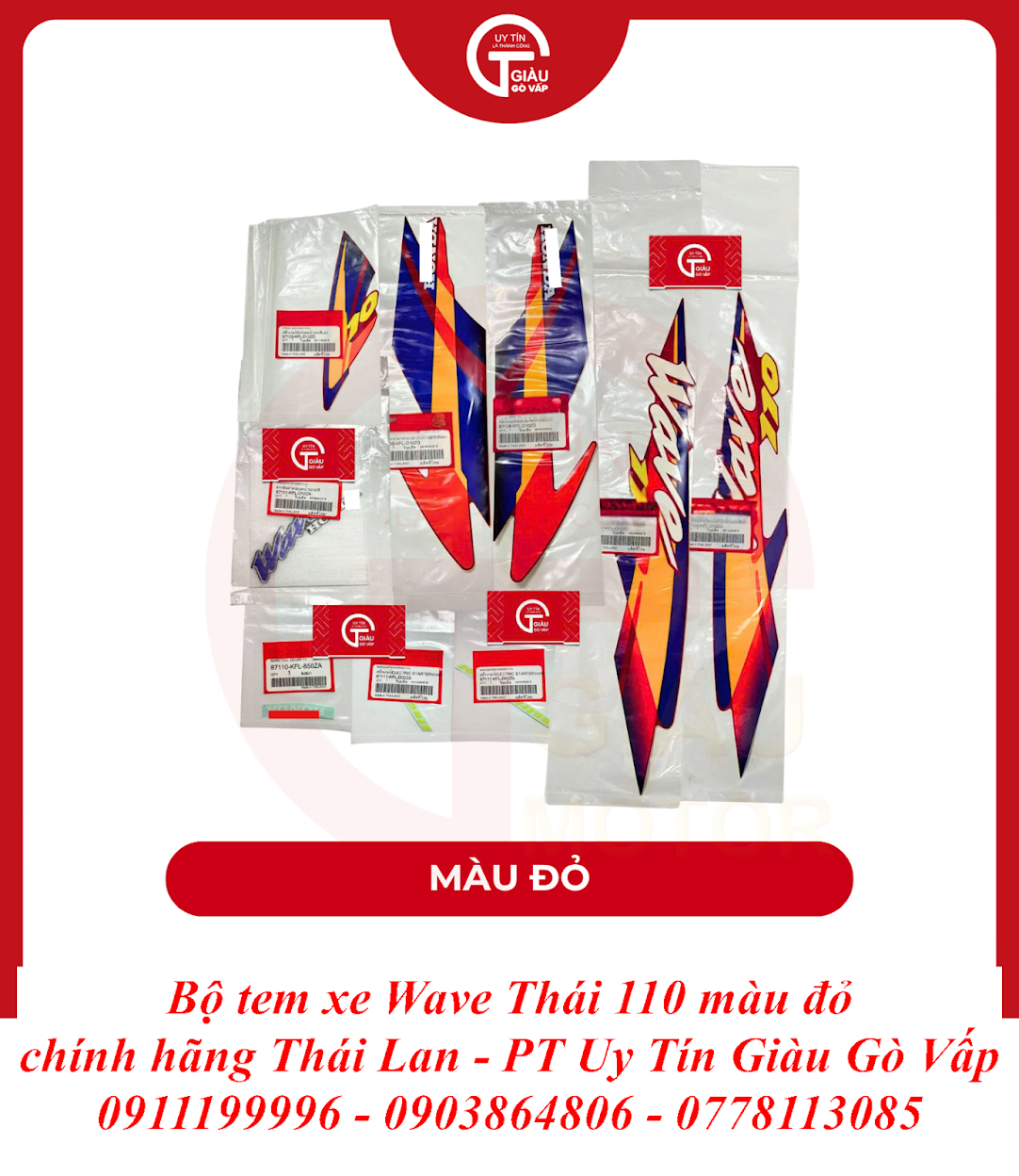 Giàu Gò Vấp là địa chỉ uy tín được cộng đồng người chơi xe Wave Thái 110 và người dùng xe máy lâu năm tại TP. Hồ Chí Minh tin tưởng. Chúng tôi cam kết mang đến cho bạn sản phẩm Bộ Tem Xe Wave Thái 110 Màu Đỏ Chất Lượng Cao Thái Lan với: