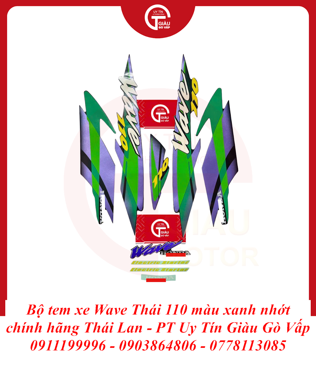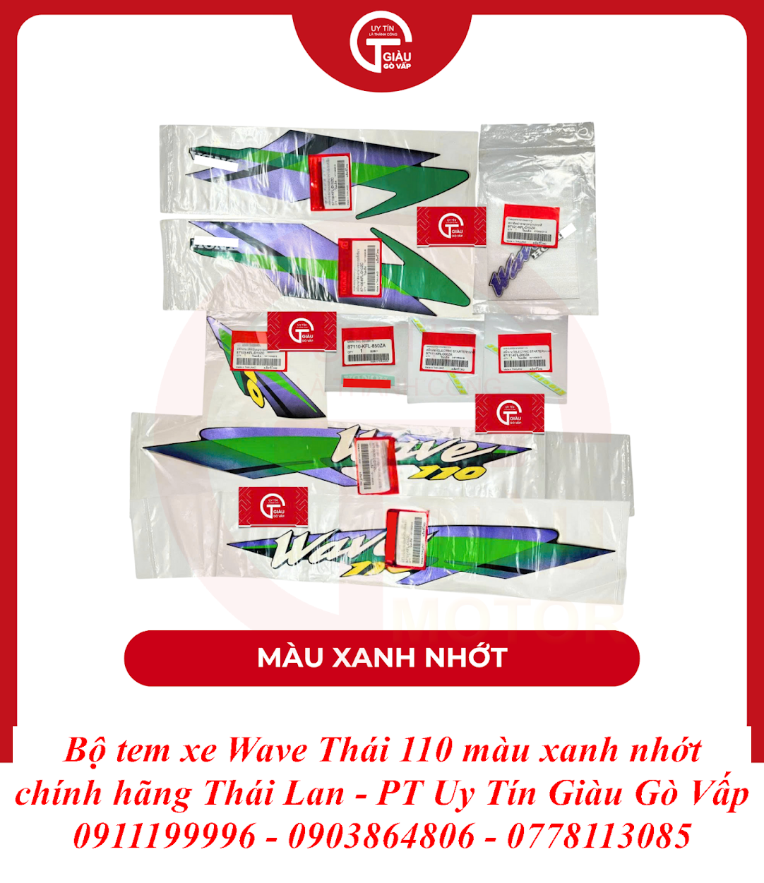Giàu Gò Vấp là địa chỉ uy tín được cộng đồng người chơi xe Wave Thái 110 và người dùng xe máy lâu năm tại TP. Hồ Chí Minh tin tưởng. Chúng tôi cam kết mang đến cho bạn sản phẩm Bộ Tem Xe Wave Thái 110 Màu Xanh Nhớt Chất Lượng Cao Thái Lan với: