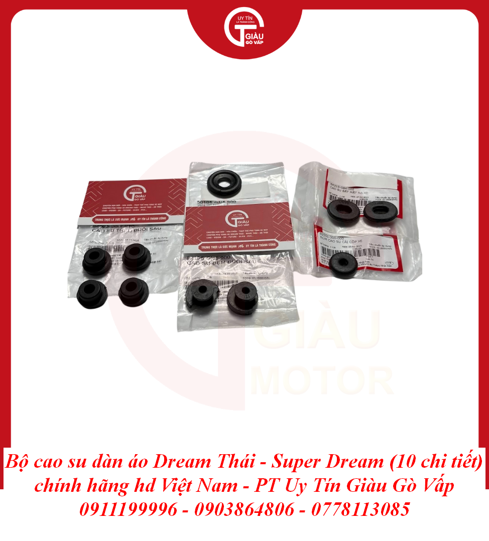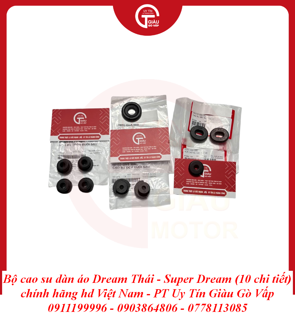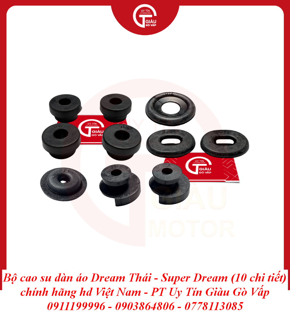 Trong kết cấu của những dòng xe huyền thoại như Dream Thái và Super Dream, Bộ Cao Su Dàn Áo đóng vai trò là lớp đệm trung gian giữa khung sườn kim loại và các chi tiết nhựa. Tuy là những chi tiết nhỏ nằm ẩn bên trong, nhưng chúng lại quyết định độ "êm" và sự chắc chắn của toàn bộ dàn áo. Một bộ cao su chính hãng sẽ giúp triệt tiêu các rung động từ động cơ, ngăn chặn tình trạng dàn nhựa bị rung rè, mang lại cảm giác lái đầm chắc và chỉn chu.
