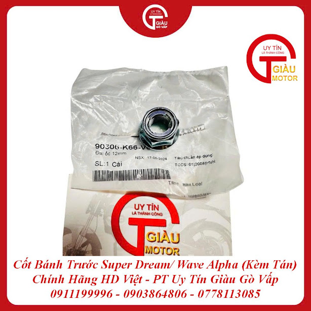 Trên các dòng xe quốc dân như Honda Super Dream và Wave Alpha, cốt bánh trước (trục bánh trước) là chi tiết cơ khí trọng yếu chịu trách nhiệm liên kết bánh xe với hệ thống phuộc trước. Một bộ Cốt Bánh Trước Chính Hãng (kèm tán) đảm bảo độ thẳng tuyệt đối, giúp bánh xe quay đều, ổn định hệ thống lái và triệt tiêu hoàn toàn tình trạng rung lắc khi di chuyển ở tốc độ cao.