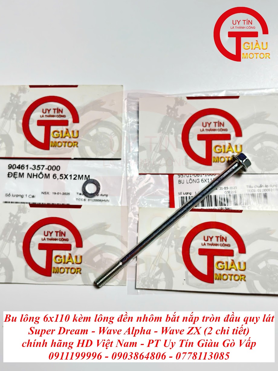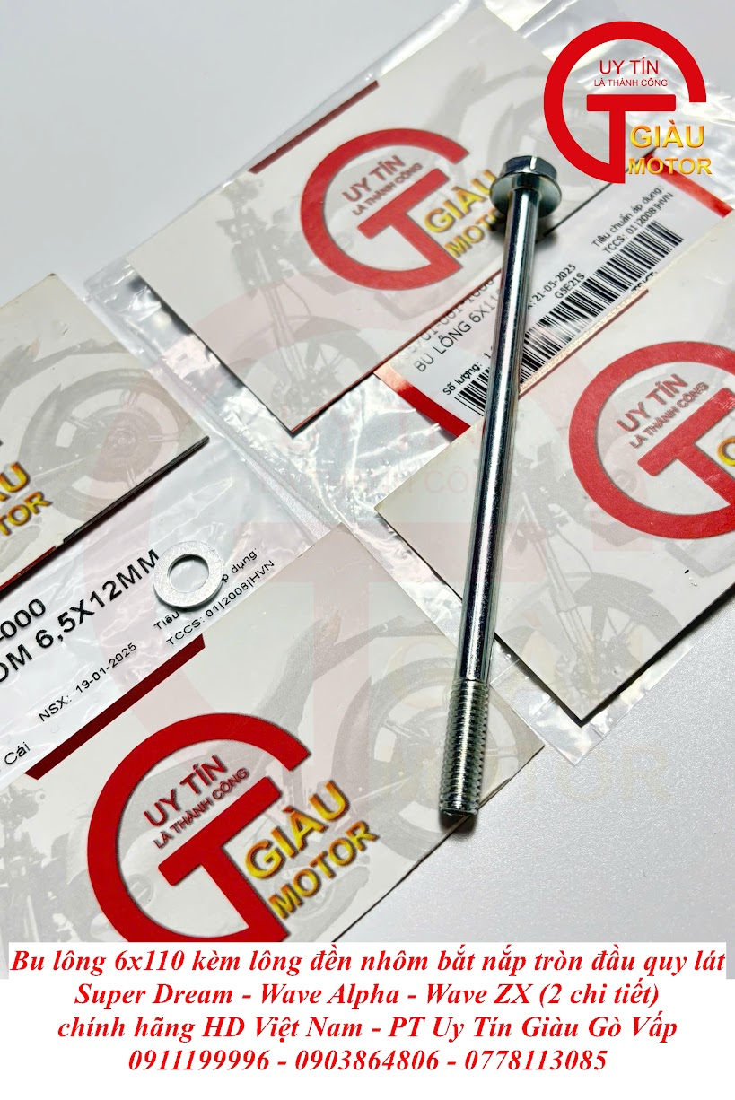 Ốc bu lông 6x110 kèm lông đền nhôm bắt nắp tròn quy lát tuy là một chi tiết nhỏ nhưng lại đóng vai trò cực kỳ quan trọng trong việc giữ kín buồng đốt và ngăn chặn sự rò rỉ dầu nhớt từ nắp quy lát (đầu bò). Đối với các dòng xe như Super Dream, Wave Alpha và Wave ZX, sau thời gian dài hoạt động dưới nhiệt độ và áp suất cao, những chiếc ốc này có thể bị giãn, mòn ren hoặc hư hỏng lông đền, dẫn đến tình trạng không còn siết chặt được nắp quy lát, gây ra rò rỉ nhớt và làm giảm hiệu suất hoạt động của động cơ.