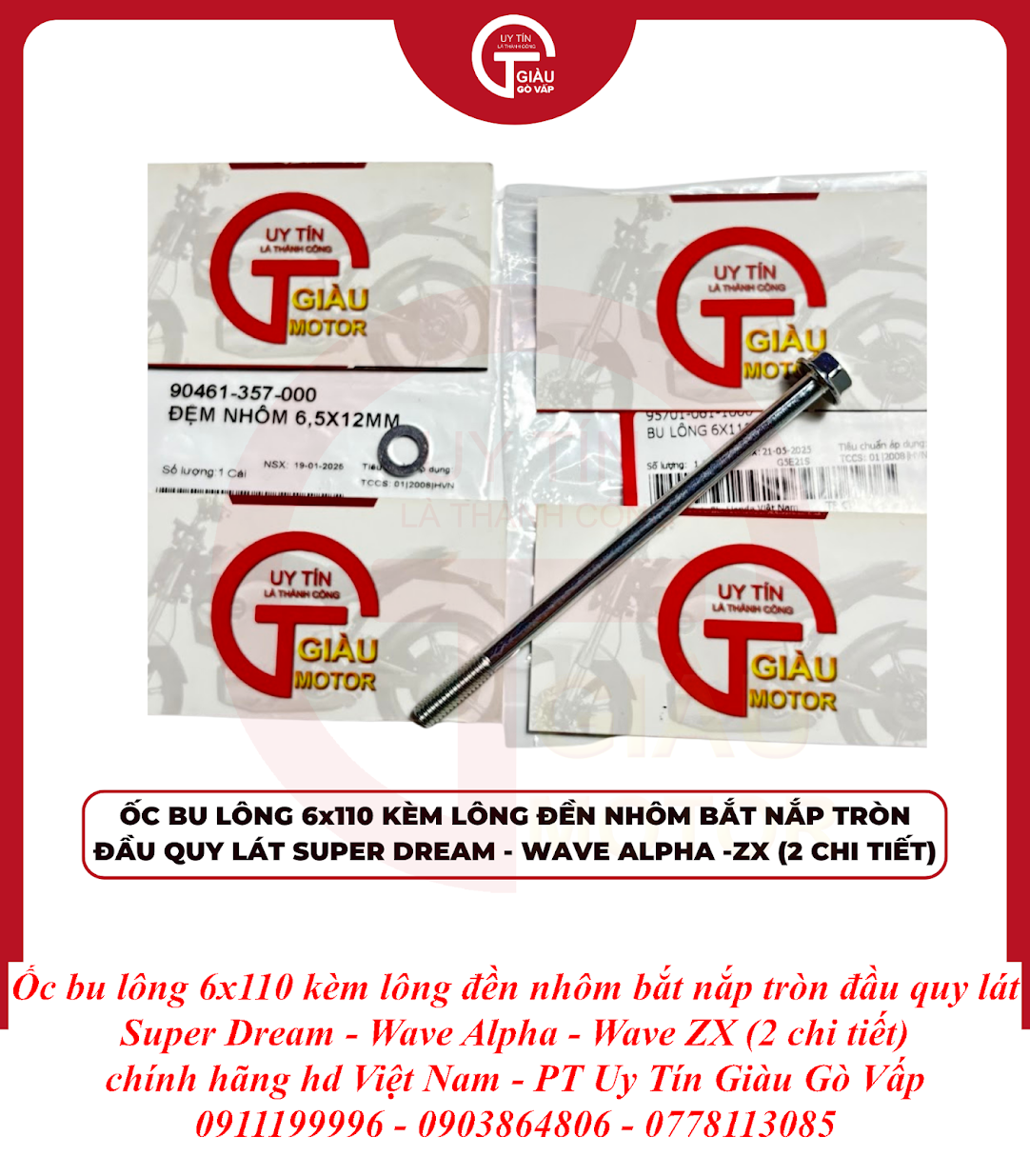 Tại Giàu Gò Vấp, chúng tôi tự hào mang đến sản phẩm Ốc Bu Lông 6x110 Kèm Lông Đền Nhôm Bắt Nắp Tròn Quy Lát Super Dream - Wave Alpha - Wave ZX Chính Hãng với những cam kết vàng, giúp bạn hoàn toàn yên tâm về chất lượng và hiệu suất: