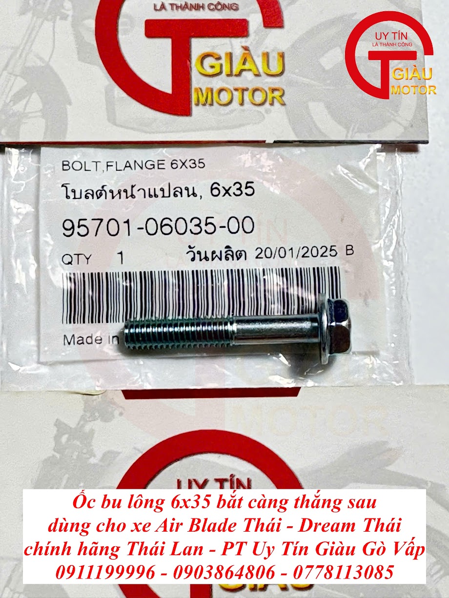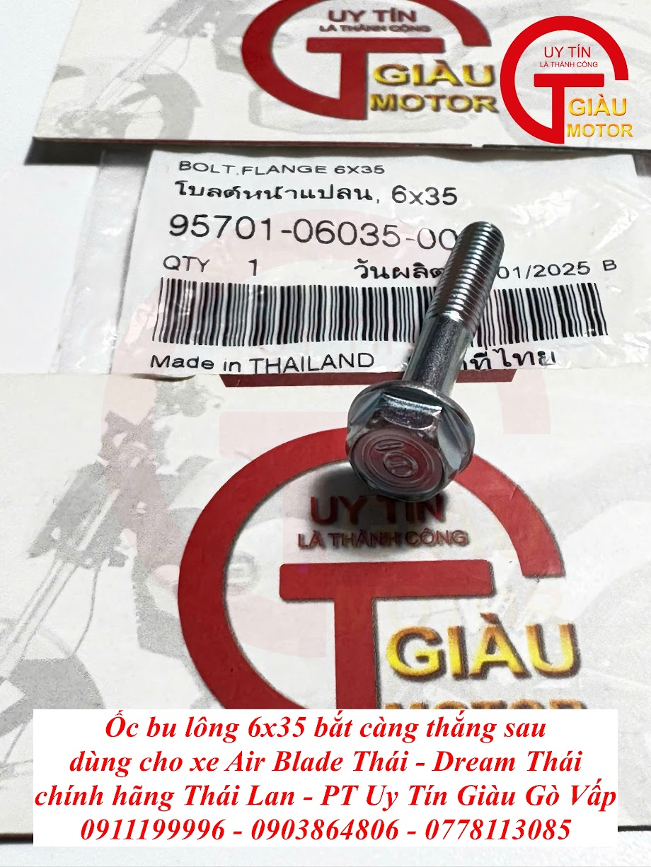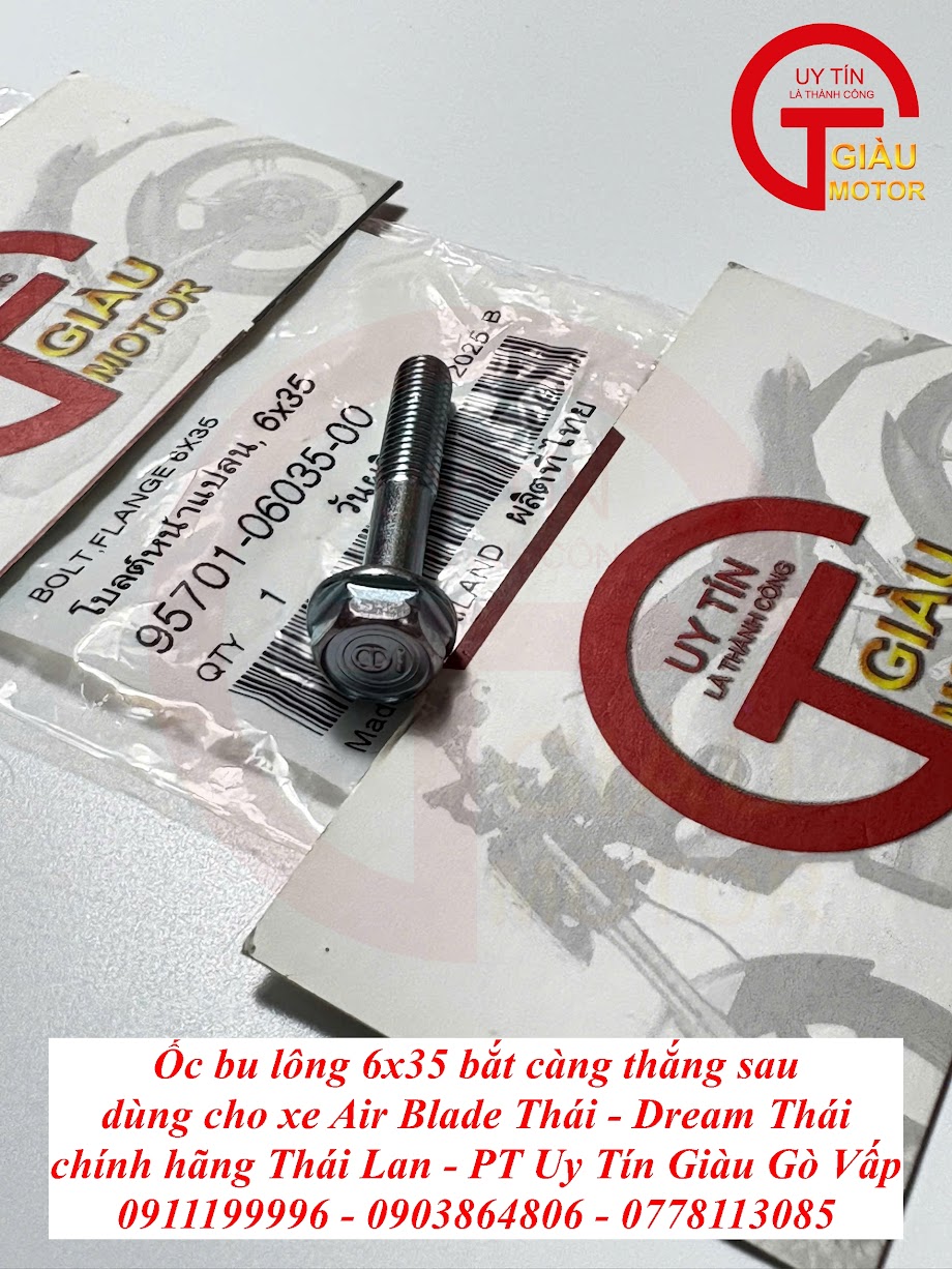 Đừng để những chi tiết nhỏ làm ảnh hưởng đến sự an toàn và giá trị của chiếc xe bạn! Hãy đến ngay Giàu Gò Vấp – cửa hàng phụ tùng xe máy uy tín hàng đầu tại TP. Hồ Chí Minh, chuyên cung cấp Ốc Bu Lông 6x35 Bắt Càng Thắng Sau Air Blade Thái - Dream Thái Chính Hãng Thái Lan. Chúng tôi cam kết mang lại sự chắc chắn, an toàn tuyệt đối và độ bền vượt trội chuẩn "zin" Thái Lan cho "xế cưng" của bạn!