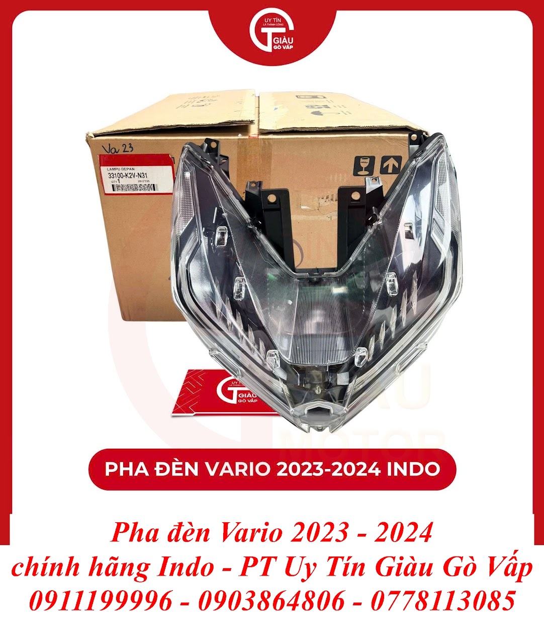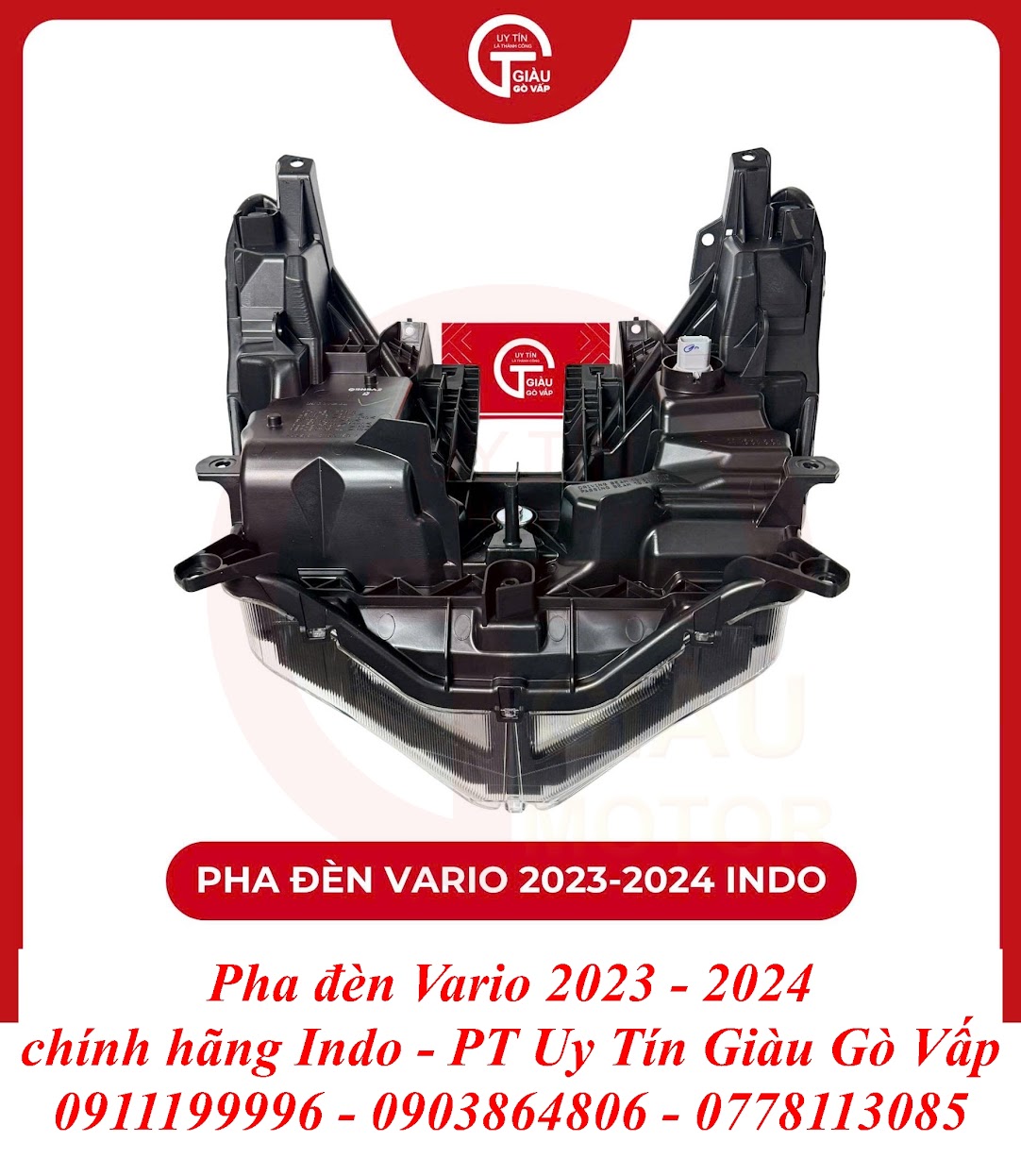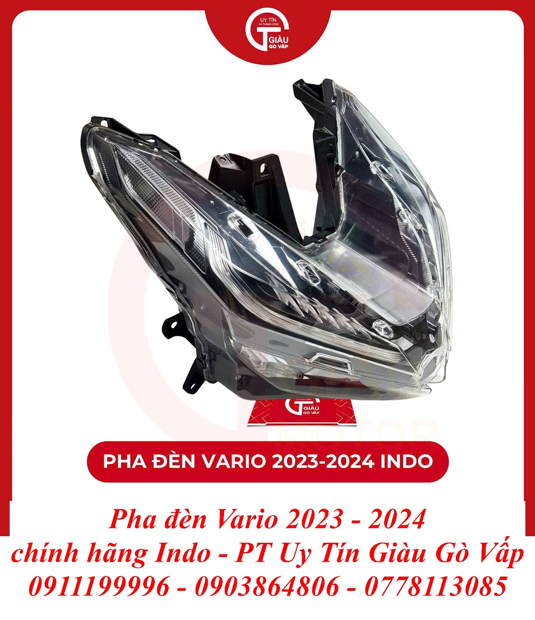 Dòng xe Vario (đời 2023 - 2024) với các phiên bản 125 và 160 sở hữu thiết kế cụm đèn pha LED cực kỳ hầm hố và hiện đại. Pha Đèn Chính Hãng Indo không chỉ đóng vai trò chiếu sáng an toàn mà còn là điểm nhấn thẩm mỹ quan trọng nhất của phần đầu xe. Việc sử dụng hàng chính hãng giúp duy trì cường độ sáng chuẩn, bảo vệ hệ thống điện phức tạp và giữ trọn giá trị cho chiếc xe nhập khẩu thế hệ mới của bạn.