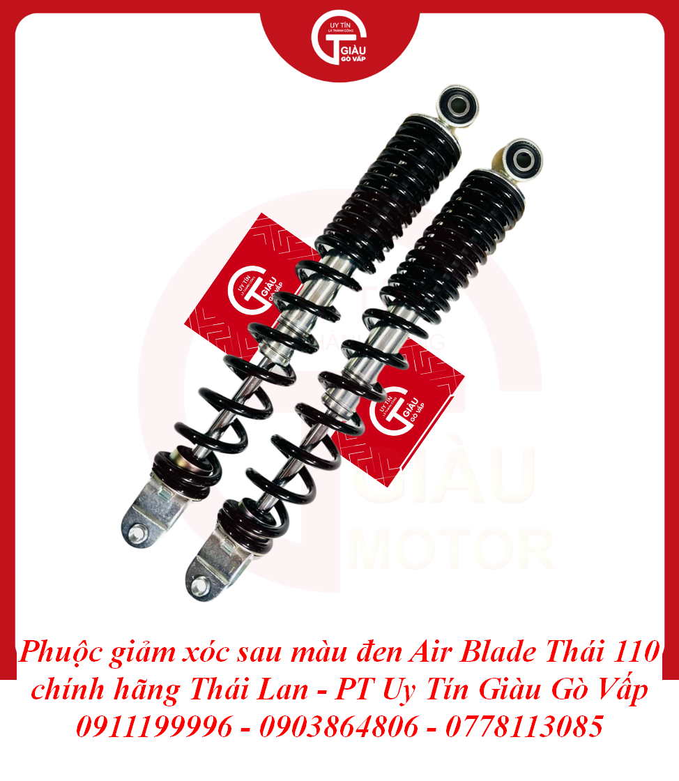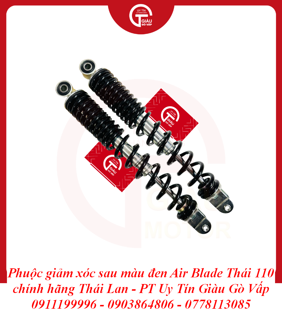 Giàu Gò Vấp là địa chỉ uy tín được cộng đồng người chơi xe Air Blade Thái và người dùng xe máy lâu năm tại TP. Hồ Chí Minh tin tưởng. Chúng tôi cam kết mang đến cho bạn sản phẩm Phuộc Giảm Xóc Sau Air Blade Thái 110 Màu Đen Chính Hãng Thái Lan với: