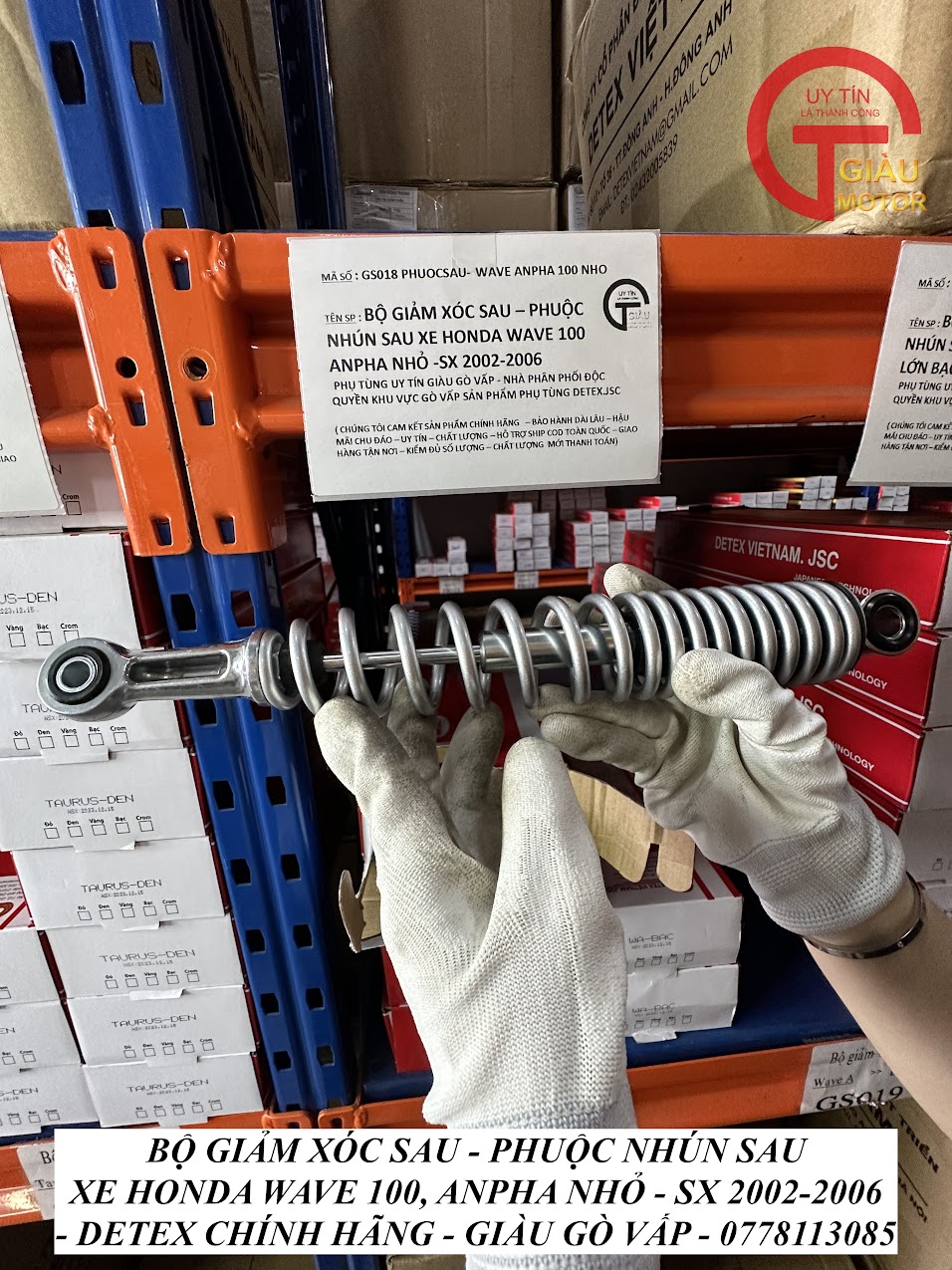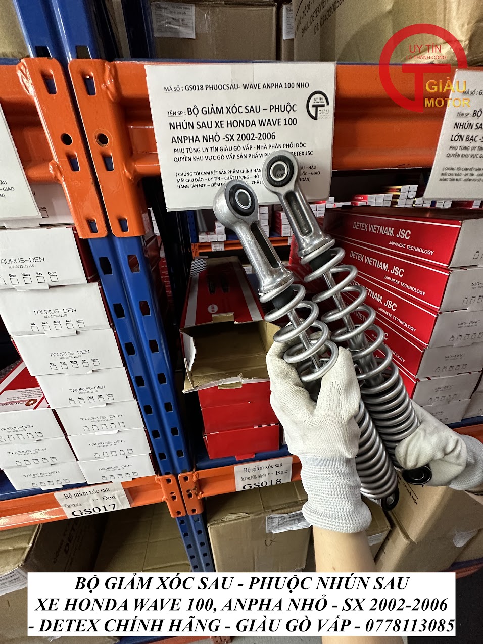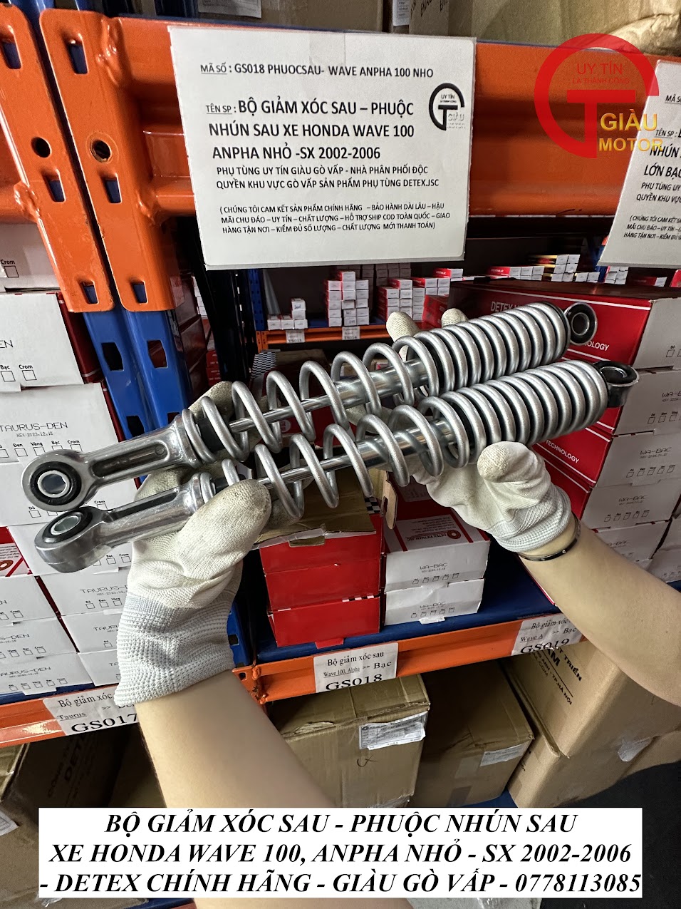 - Qúy khách có thể mua sản phẩm phuộc giảm xóc sau xe Honda Wave 100 Alpha (nhỏ) hàng Detex chính hãng tại của hàng Phụ tùng Giàu Gò Vấp.
