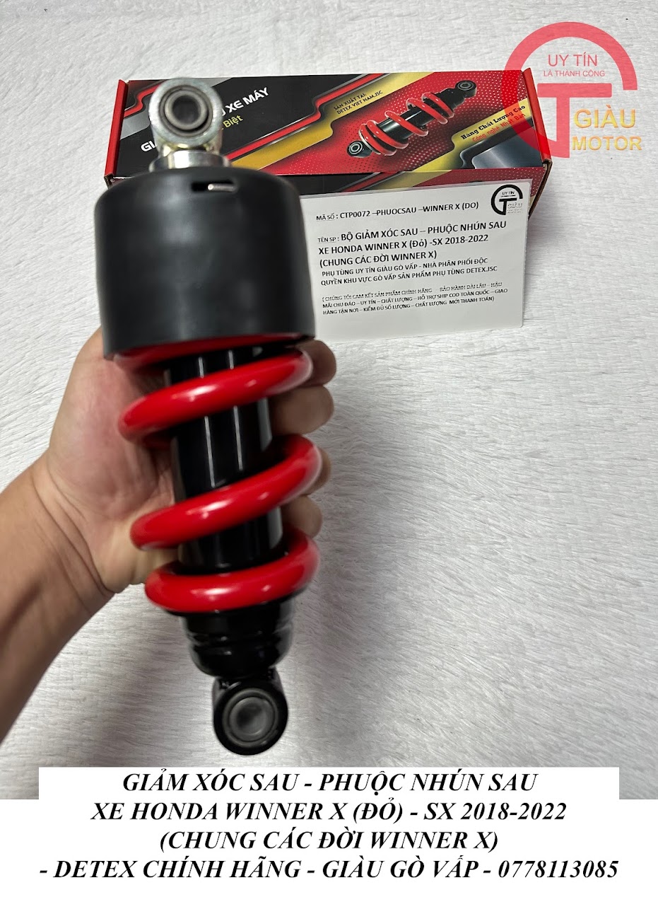 - Sản phẩm phuộc giảm xóc sau xe Honda Winner X hàng Detex.JSC chính hãng có thông số kỹ thuật, nguồn nguyên liệu, con ốc, nước mạ,.. luôn theo tiêu chuẩn của Honda và Yamaha lắp ráp như zin theo xe chính hãng.