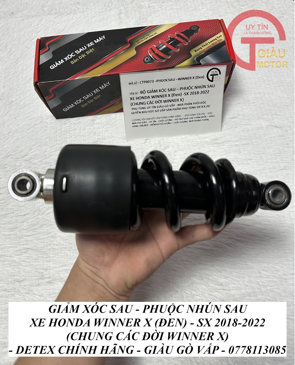 Nếu bạn đang cần phuộc giảm xóc sau cho Winner X với chất lượng hàng đầu và giá tốt, hãy đến ngay Giàu Gò Vấp. Chúng tôi cam kết mang đến sản phẩm chính hãng Detex.JSC, bảo hành dài hạn cùng dịch vụ tư vấn chuyên nghiệp, chắc chắn sẽ làm hài lòng mọi khách hàng.