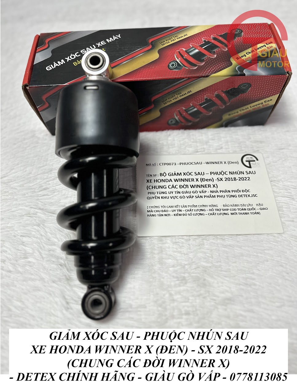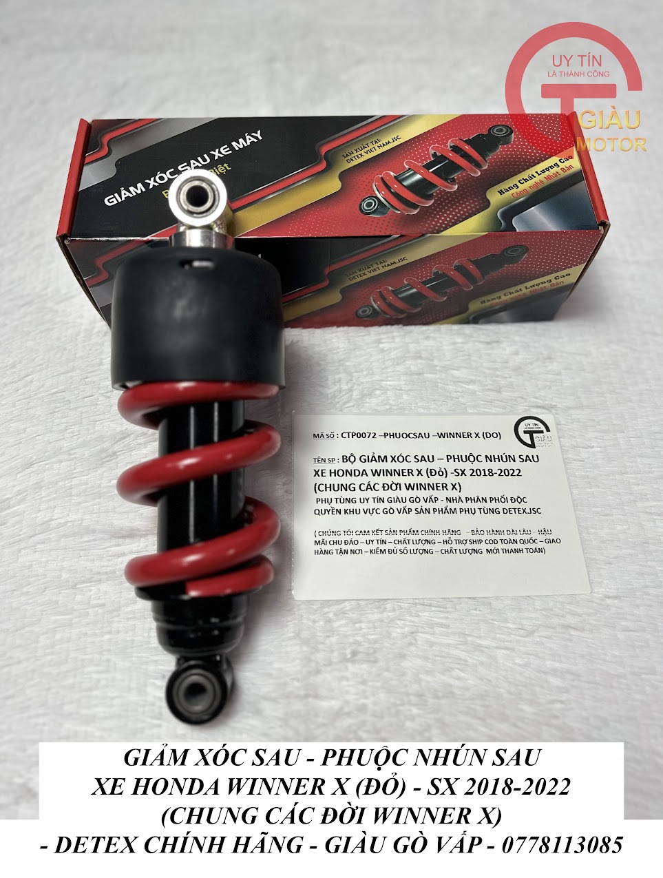 - Cửa hàng phụ tùng Giàu Gò Vấp là một trong những địa chỉ uy tín chuyên cung cấp các loại phụ tùng xe máy chính hãng, chất lượng cao. Cửa hàng có đầy đủ các loại phuộc giảm xóc sau xe Winner X hàng Detex.JSC. Các sản phẩm tại cửa hàng đều được nhập khẩu trực tiếp từ nhà sản xuất, có đầy đủ giấy tờ chứng minh nguồn gốc xuất xứ.