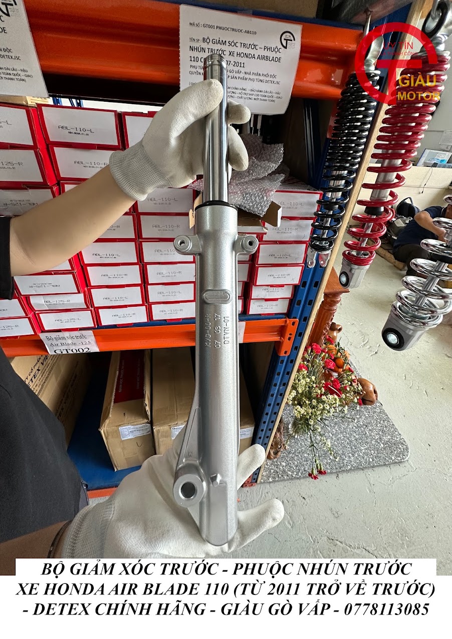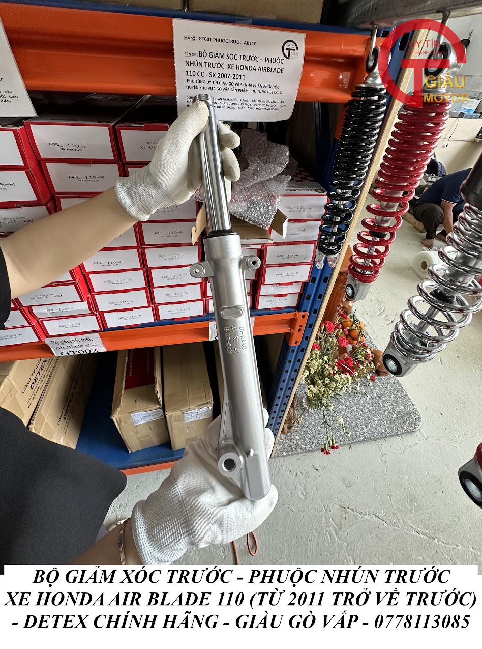 Tại cửa hàng phụ tùng Giàu Gò Vấp, chúng tôi cung cấp phuộc giảm xóc trước xe honda Air Blade 110 hàng DETEX chính hãng, giá rẻ. Sản phẩm được sản xuất tại Việt Nam, đảm bảo chất lượng và nguồn gốc xuất xứ.