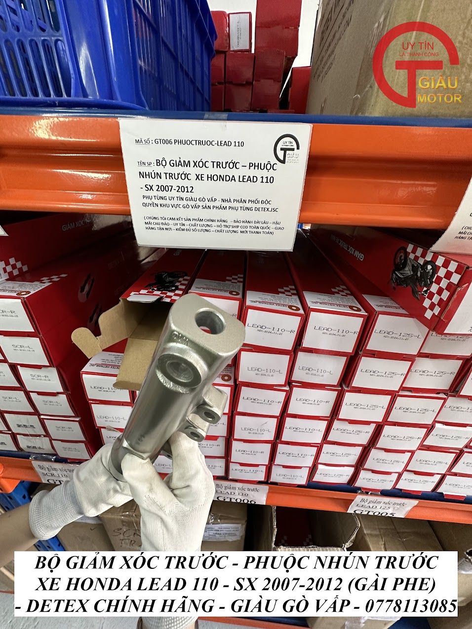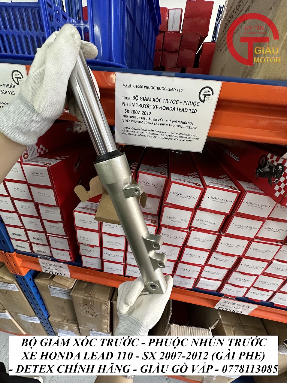 - Tại cửa hàng phụ tùng Giàu Gò Vấp, chúng tôi cung cấp phuộc giảm trước xe Honda Lead 110 (gài phe) hàng DETEX chính hãng, giá rẻ. Sản phẩm được sản xuất từ chất liệu cao cấp, có độ bền cao, chịu được lực tác động lớn, êm ái như nệm, ổ gà cũng không thể làm khó. Thiết kế nhỏ gọn, chắc chắn, phù hợp với dòng xe Honda Lead 110.