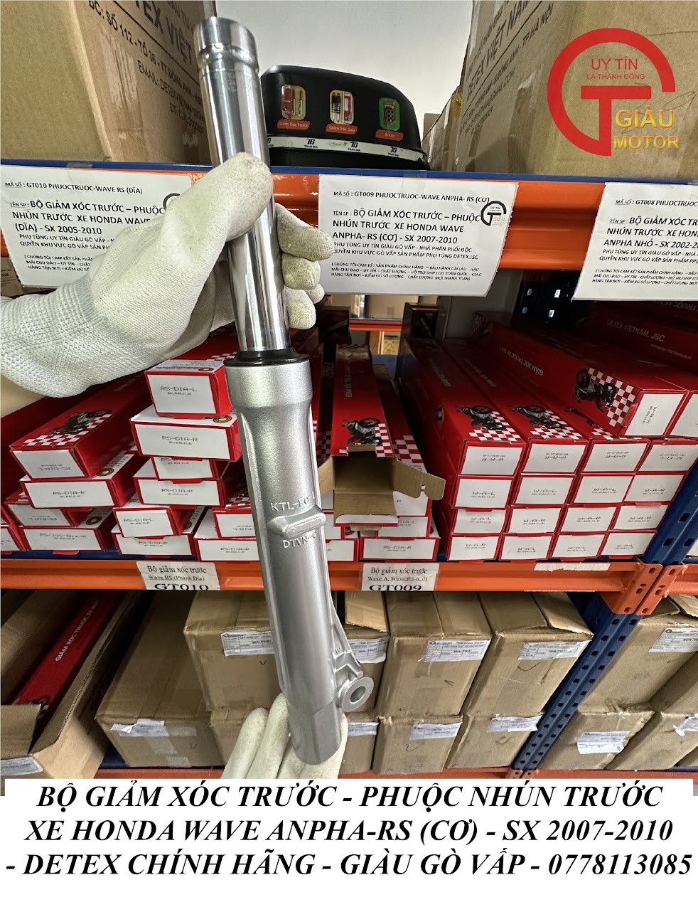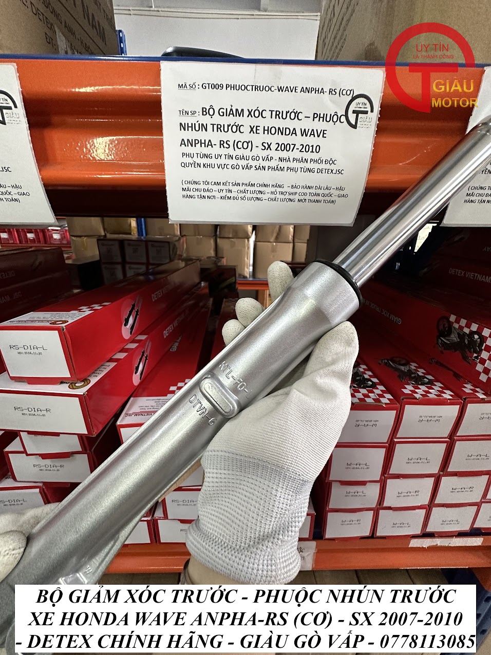 - Qúy khách có thể mua sản phẩm phuộc giảm xóc trước xe Honda Wave A, Wave RS (cơ) hàng Detex chính hãng tại của hàng Phụ tùng Giàu Gò Vấp.