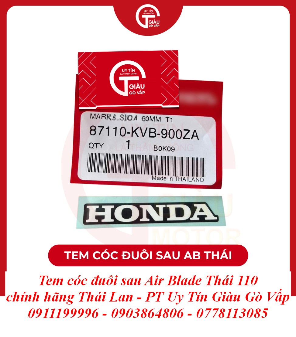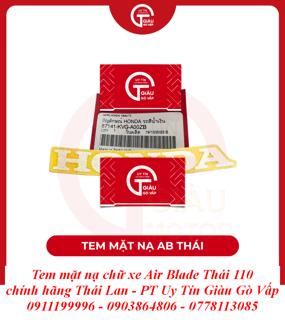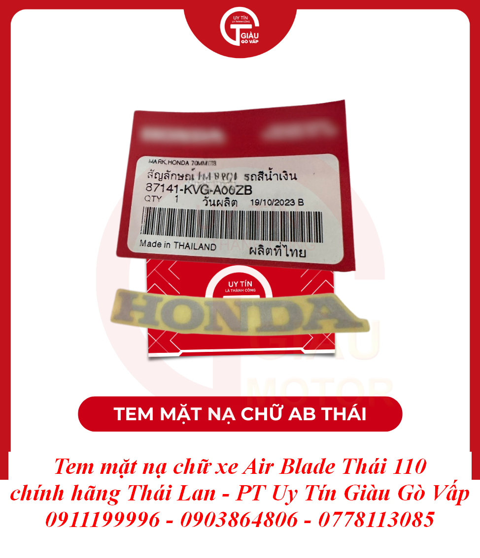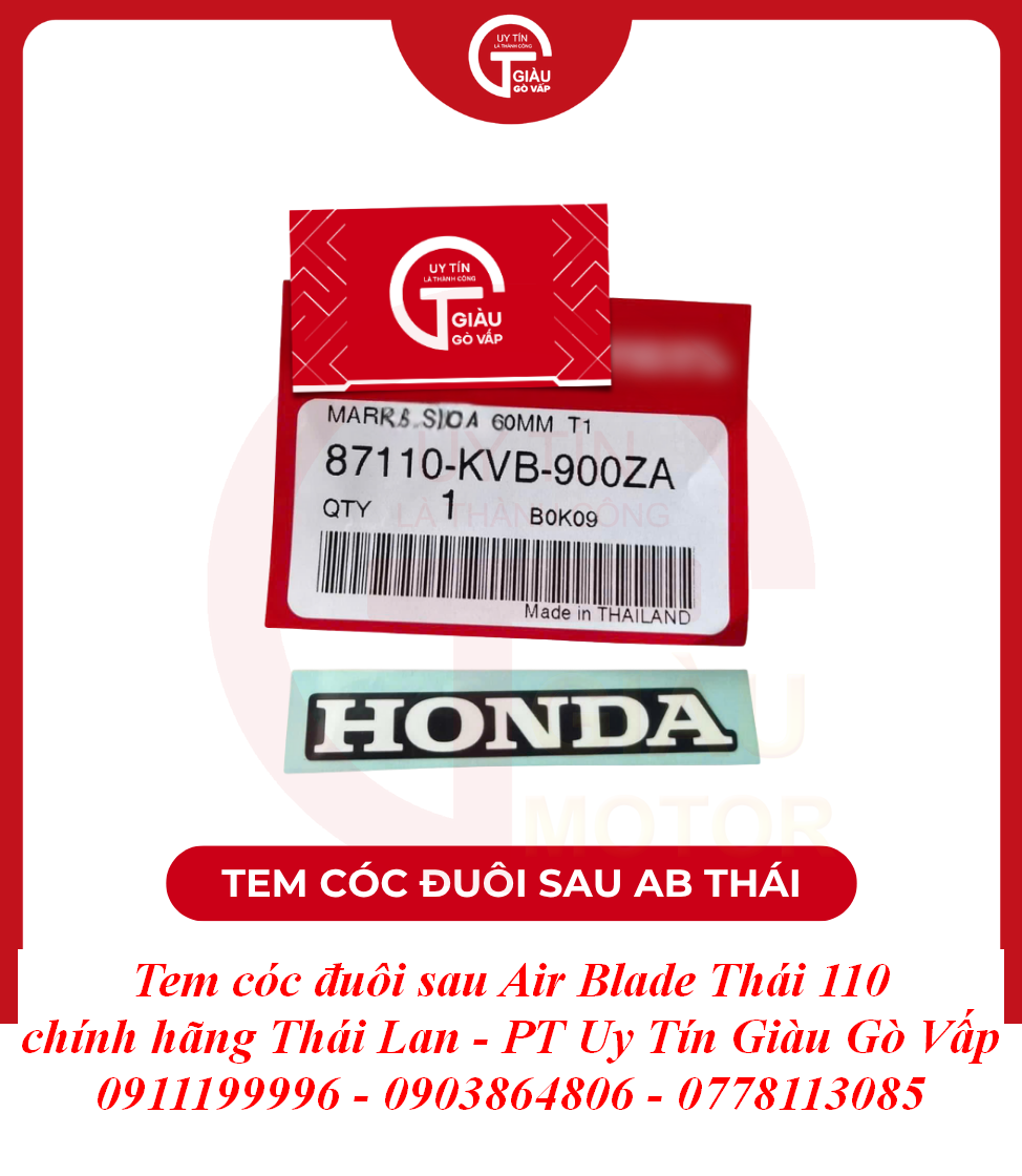 Bạn đang tìm kiếm Tem Cóc Đuôi Sau và Tem Mặt Nạ Chữ dành cho xe Air Blade Thái 110, hàng chính hãng từ Thái Lan? Cửa hàng phụ tùng Giàu Gò Vấp là địa chỉ uy tín, đáng tin cậy tại TP. Hồ Chí Minh, nơi bạn có thể hoàn toàn yên tâm về chất lượng và độ bền của sản phẩm.