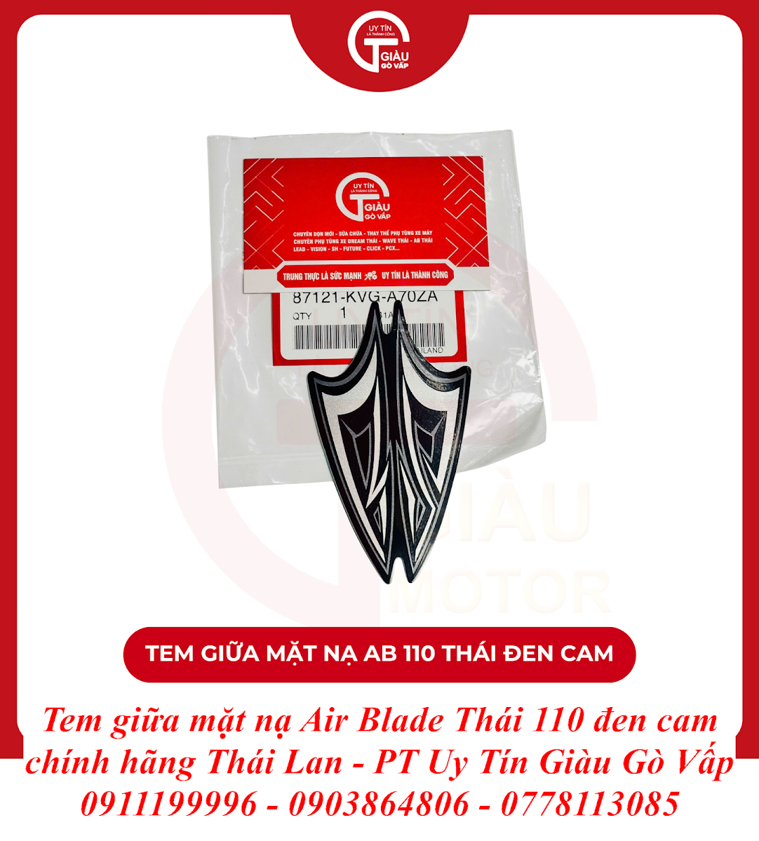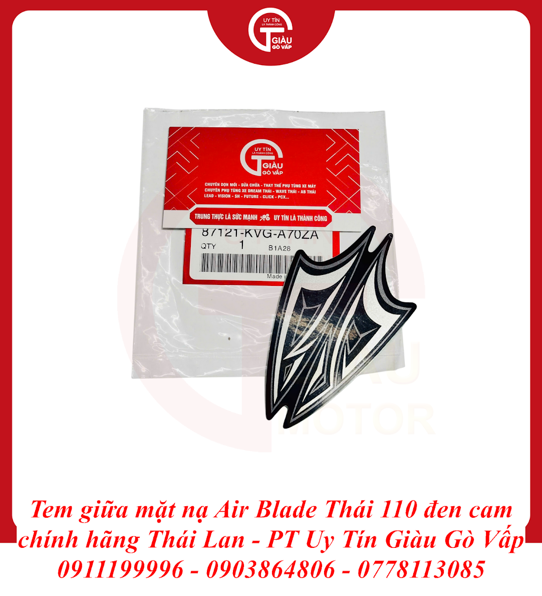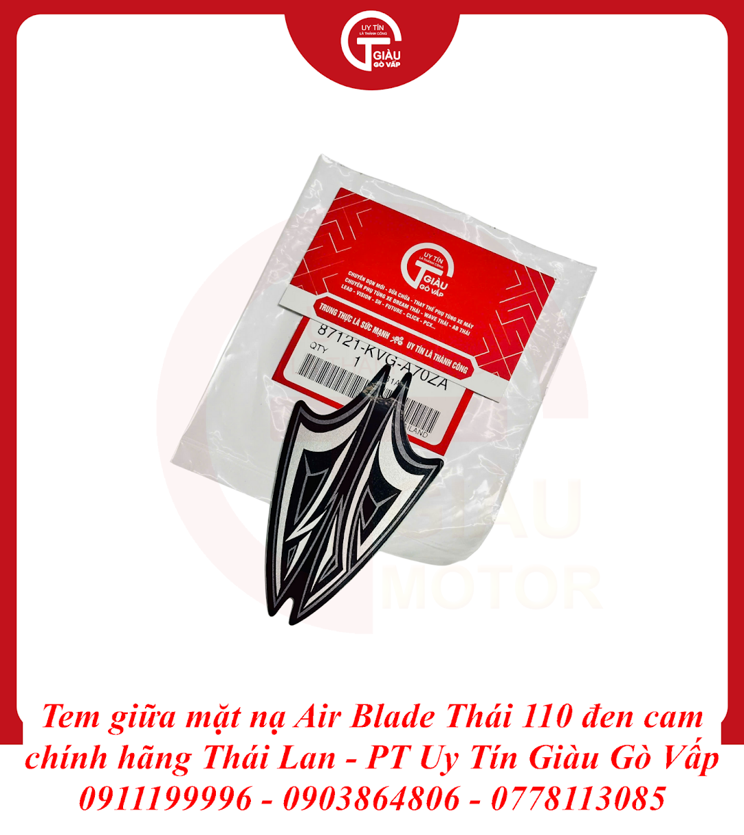 Tại Giàu Gò Vấp, chúng tôi tự hào mang đến sản phẩm Tem Giữa Mặt Nạ Air Blade Thái 110 Đen Cam Chính Hãng Thái Lan với những cam kết vàng, giúp bạn hoàn toàn yên tâm về chất lượng và thẩm mỹ: