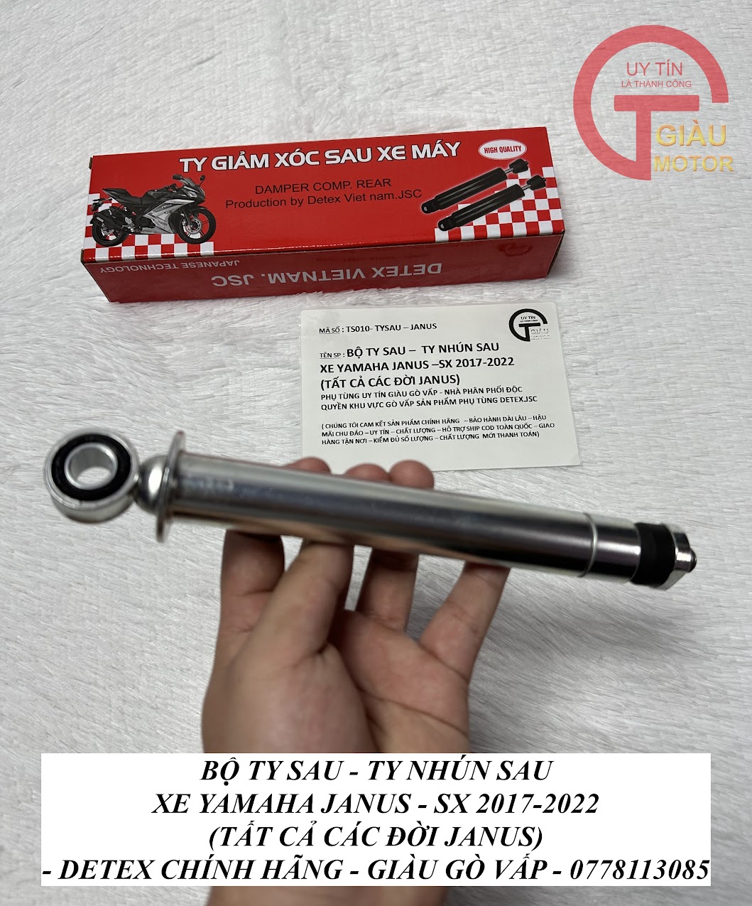 Bạn đang tìm kiếm Ty Giảm Xóc Sau Chính Hãng cho chiếc Yamaha Janus của mình? Đừng bỏ lỡ sản phẩm Ty Giảm Xóc Sau Xe Janus Hàng Detex.JSC Chính Hãng với chất lượng tuyệt vời, giúp xe vận hành êm ái, bền bỉ hơn. Hãy đặt mua ngay tại Giàu Gò Vấp – cửa hàng phụ tùng uy tín với dịch vụ Ship COD toàn quốc, mang đến sự tiện lợi và tiết kiệm cho bạn!