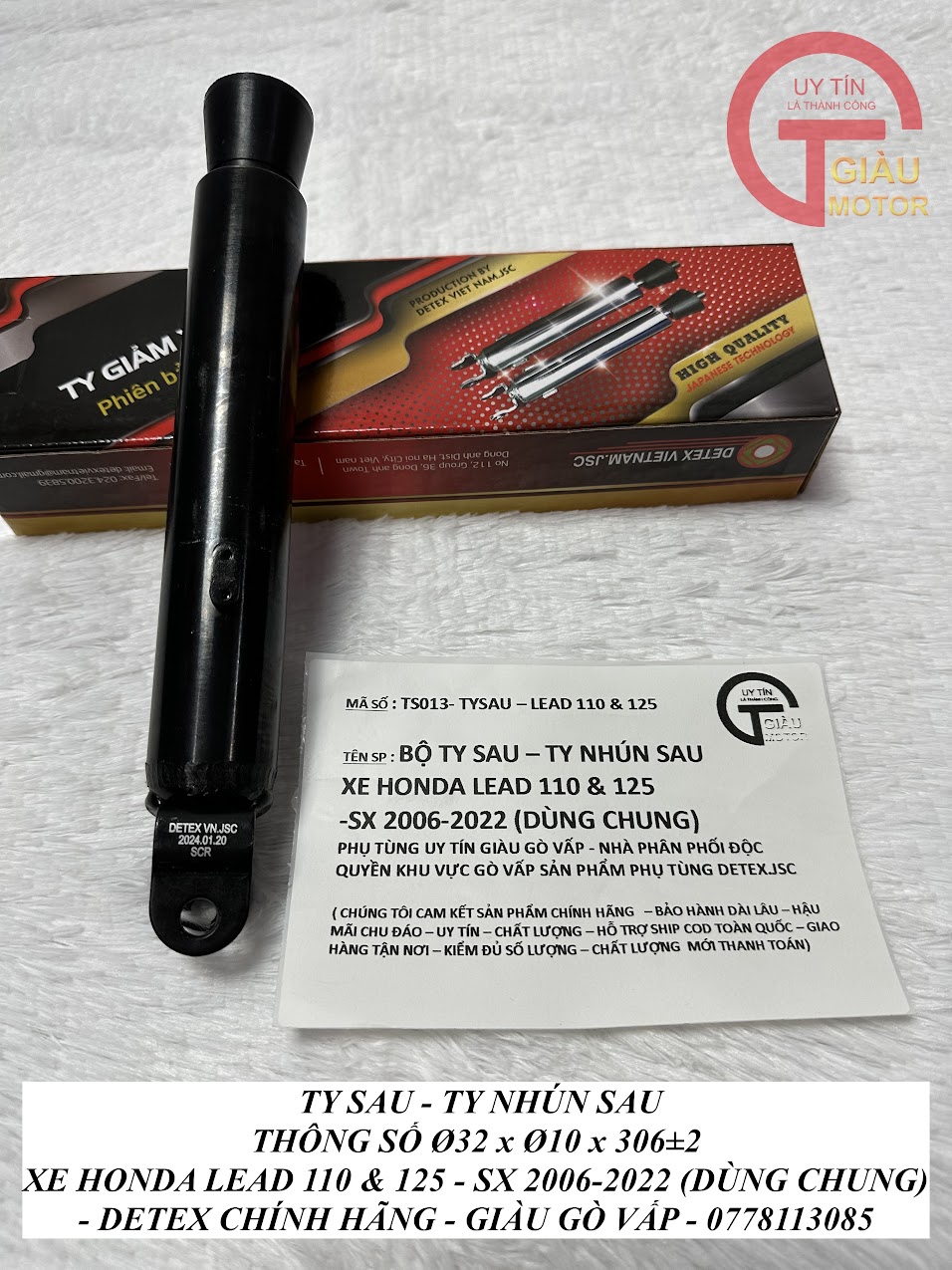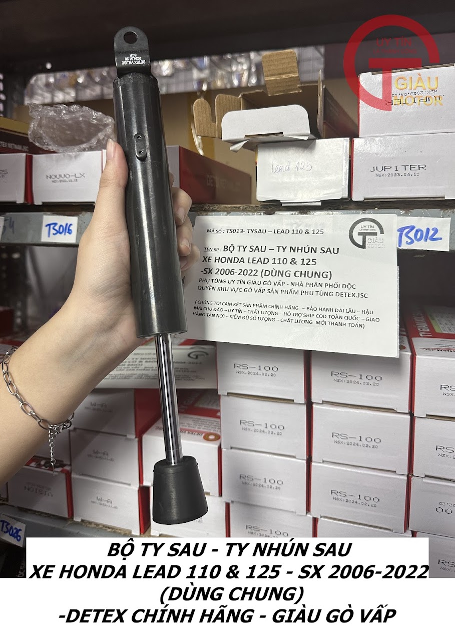 - Tại cửa hàng phụ tùng Giàu Gò Vấp, chúng tôi cung cấp ty phuộc nhún giảm xóc sau xe Honda Lead 110 và Lead 125 hàng Detex.JSC chính hãng, giá rẻ.