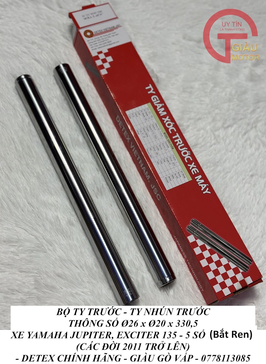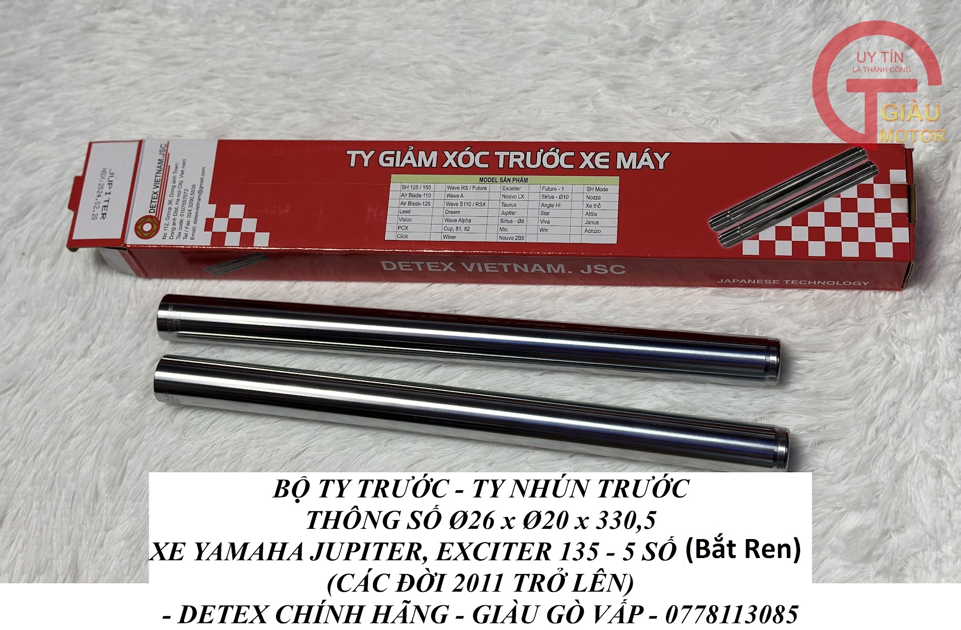 - Tại cửa hàng phụ tùng Giàu Gò Vấp, chúng tôi cung cấp ty phuộc nhún giảm xóc trước xe Yamaha Jupiter và Exciter 135 - 5 số hàng Detex.JSC chính hãng, giá rẻ.