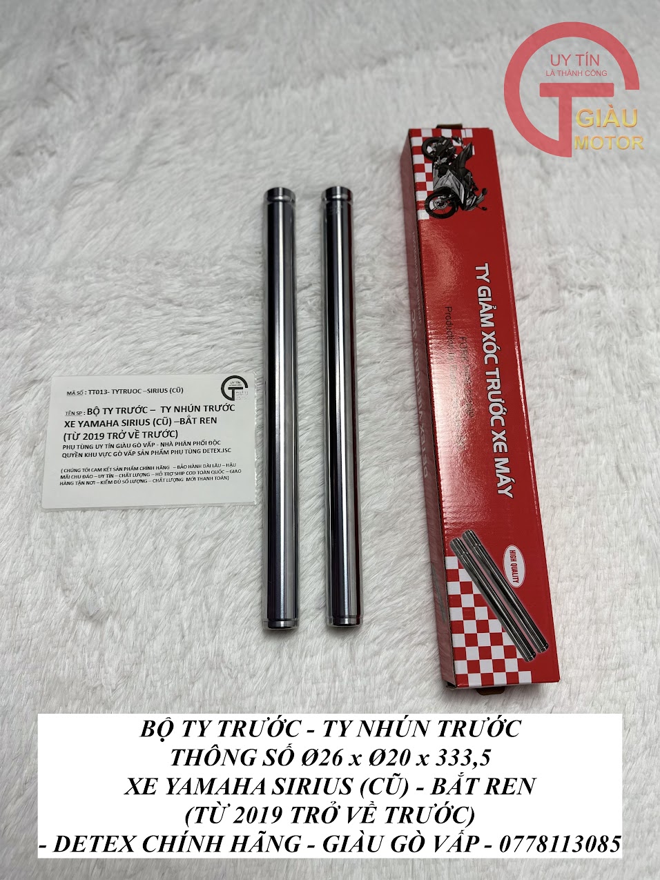 - Ty giảm xóc trước xe Sirius cũ hàng Detex.JSC chính hãng là một trong những sản phẩm được bán chạy nhất tại cửa hàng Giàu Gò Vấp. Sản phẩm được nhập khẩu chính hãng, có đầy đủ giấy tờ chứng minh nguồn gốc xuất xứ.