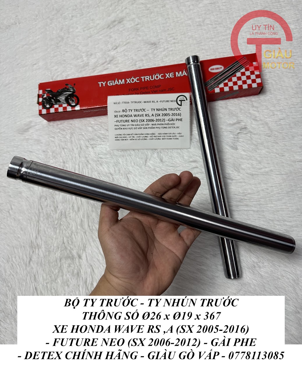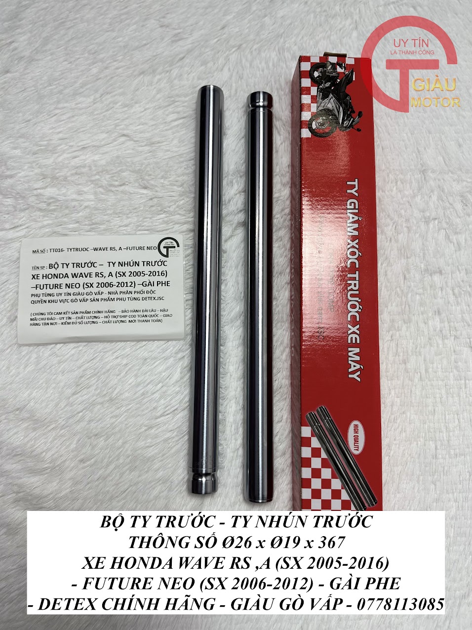 - Qúy khách có thể mua sản phẩm Ty giảm xóc trước xe Wave Rs, Wave A, Future Neo hàng Detex chính hãng tại của hàng Phụ tùng Giàu Gò Vấp.